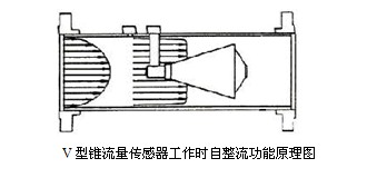 V型錐流量計(jì)是差壓式流量計(jì),也是一種通過(guò)節(jié)流取差壓以反映流量大小的節(jié)流裝置。節(jié)流件為一個(gè)懸掛在管道中央的錐形體,高壓P1取自錐體前流體未擾動(dòng)(即未形成節(jié)流,流體未加速)的管壁 ;低壓P2取自后錐體中央,并通過(guò)引壓管引至管外,它遵從基于封閉管道中能量相互守恒的伯努力原理:當(dāng)管內(nèi)流體流經(jīng)管內(nèi)正中錐體時(shí),流體逐步被壓縮,流速加快而動(dòng)能增加,此增加的動(dòng)能,經(jīng)錐體直徑最大處后逐步釋放而在錐體后邊產(chǎn)生一個(gè)低壓帶(相對(duì)于管道壓力),從而建立了流量與其流經(jīng)V形錐前后所產(chǎn)生的差壓△P的平方根成正比。計(jì)算與孔板、噴咀等類似。