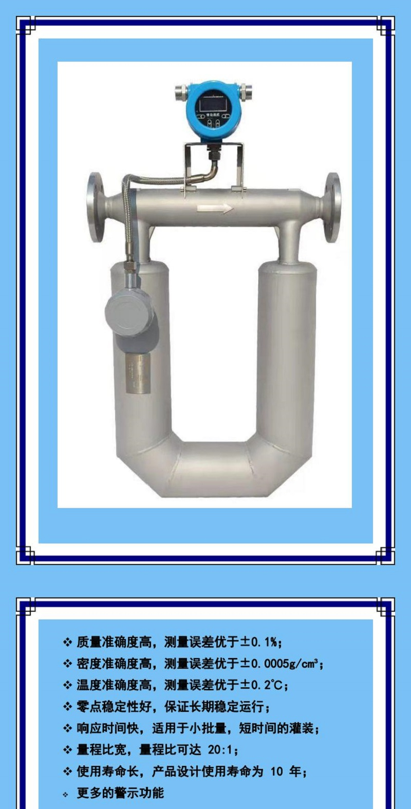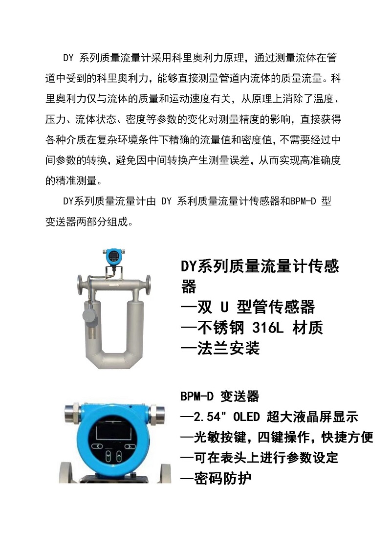 DY 系列質(zhì)量流量計(jì)采用科里奧利力原理,通過(guò)測(cè)量流體在管道中受到的科里奧利力,能夠直接測(cè)量管道內(nèi)流體的質(zhì)量流量。可測(cè)溫度:(-240~204)℃